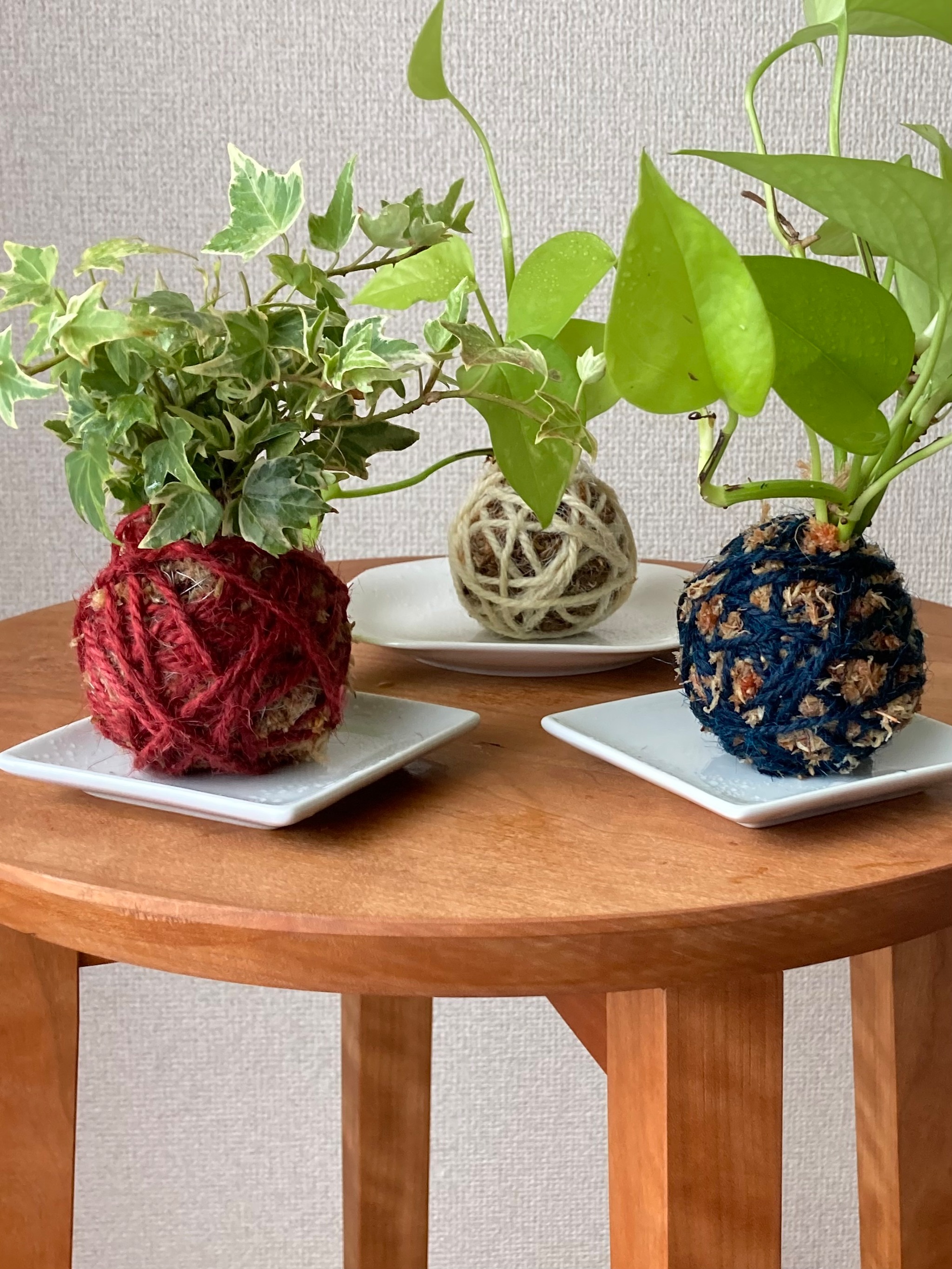 フレッシュなコケを使ったコケ玉を育てるのはなかなか難しいものです。そこで、考えたカラフルな麻ひもを巻くコケ玉を作ります。