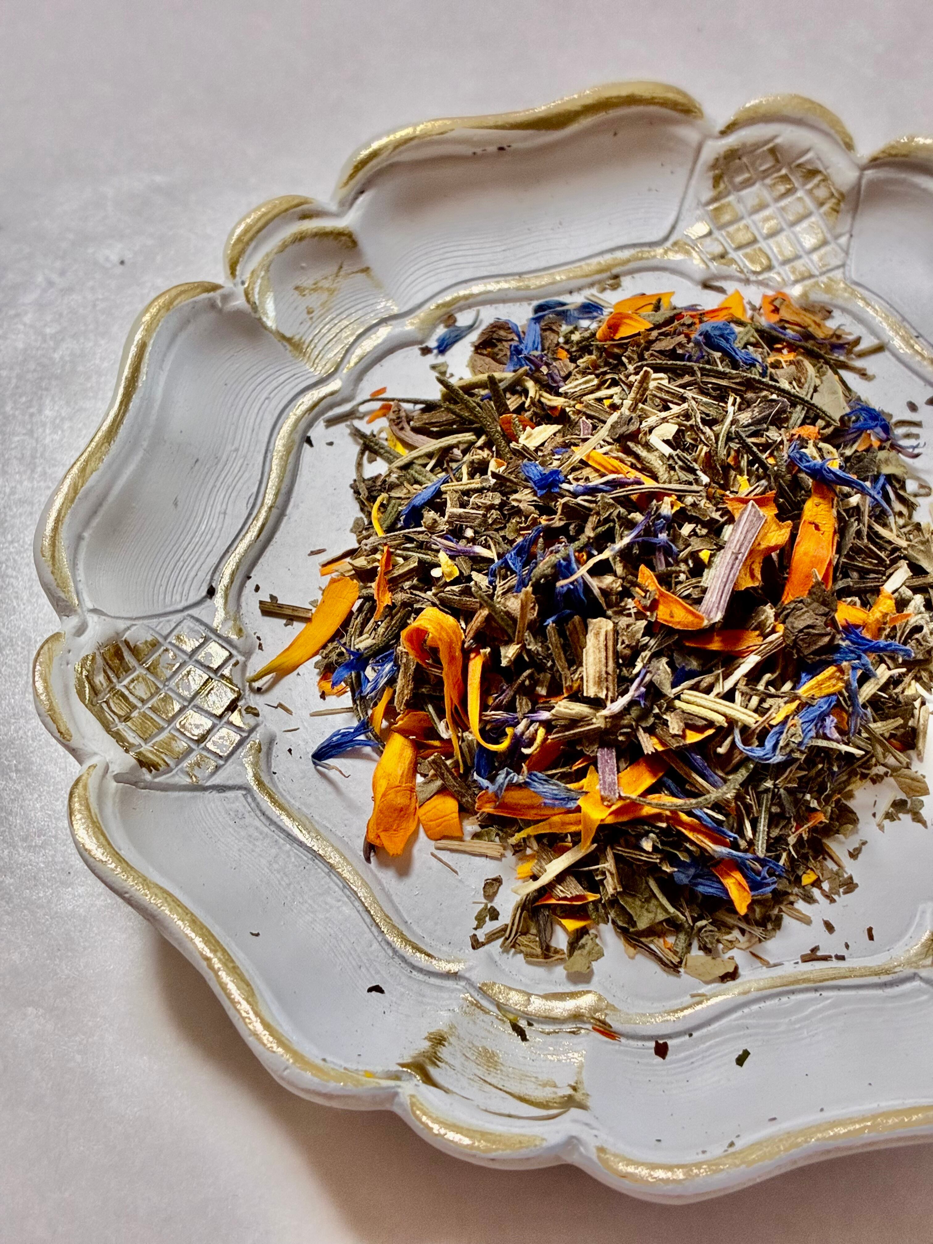 カキドオシの和ハーブをメインに、食事時にお茶感覚で召し上がっていただけます。最後に鼻に抜けるほのかな花の香りも感じてみてください。使用ハーブ(矢車草、カキドオシ、カレンデュラ、ローズマリー)