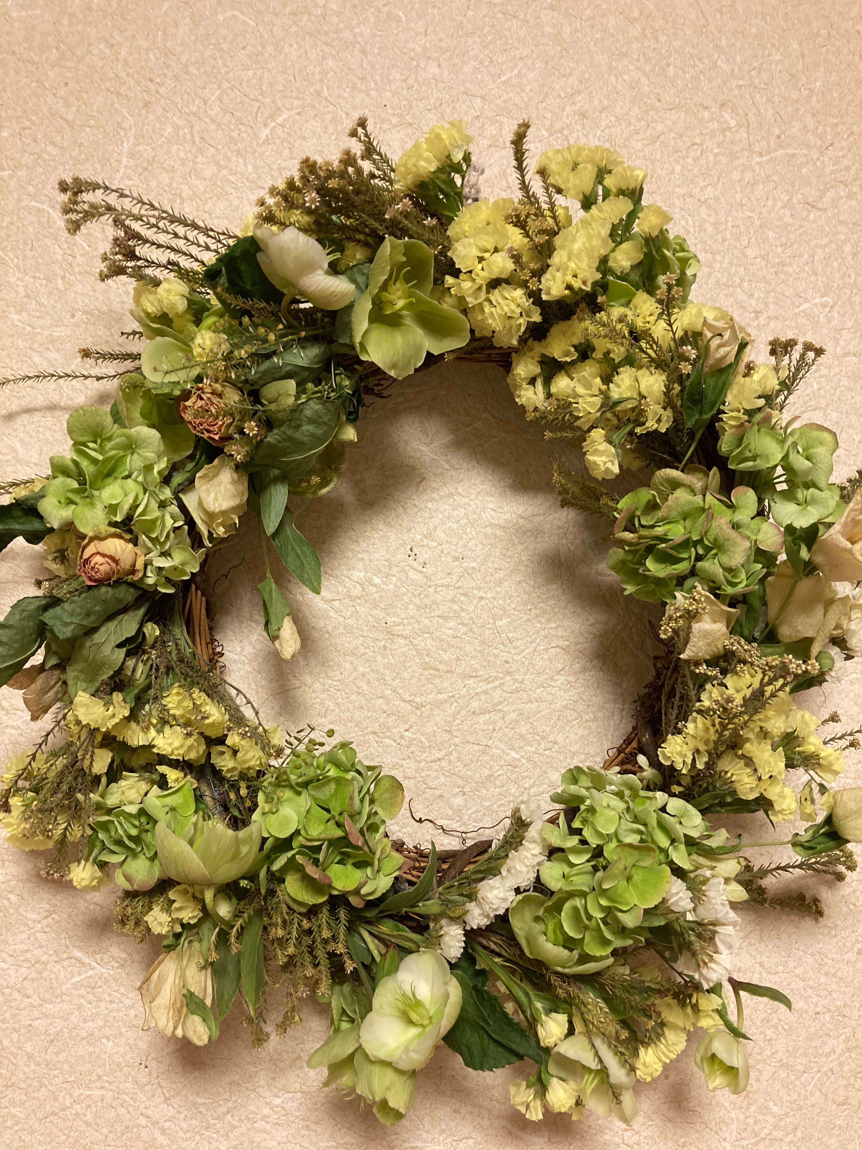 イエロー、人気のグリーンのお花をベースにワイルドフラワーをミックスしたリースです。