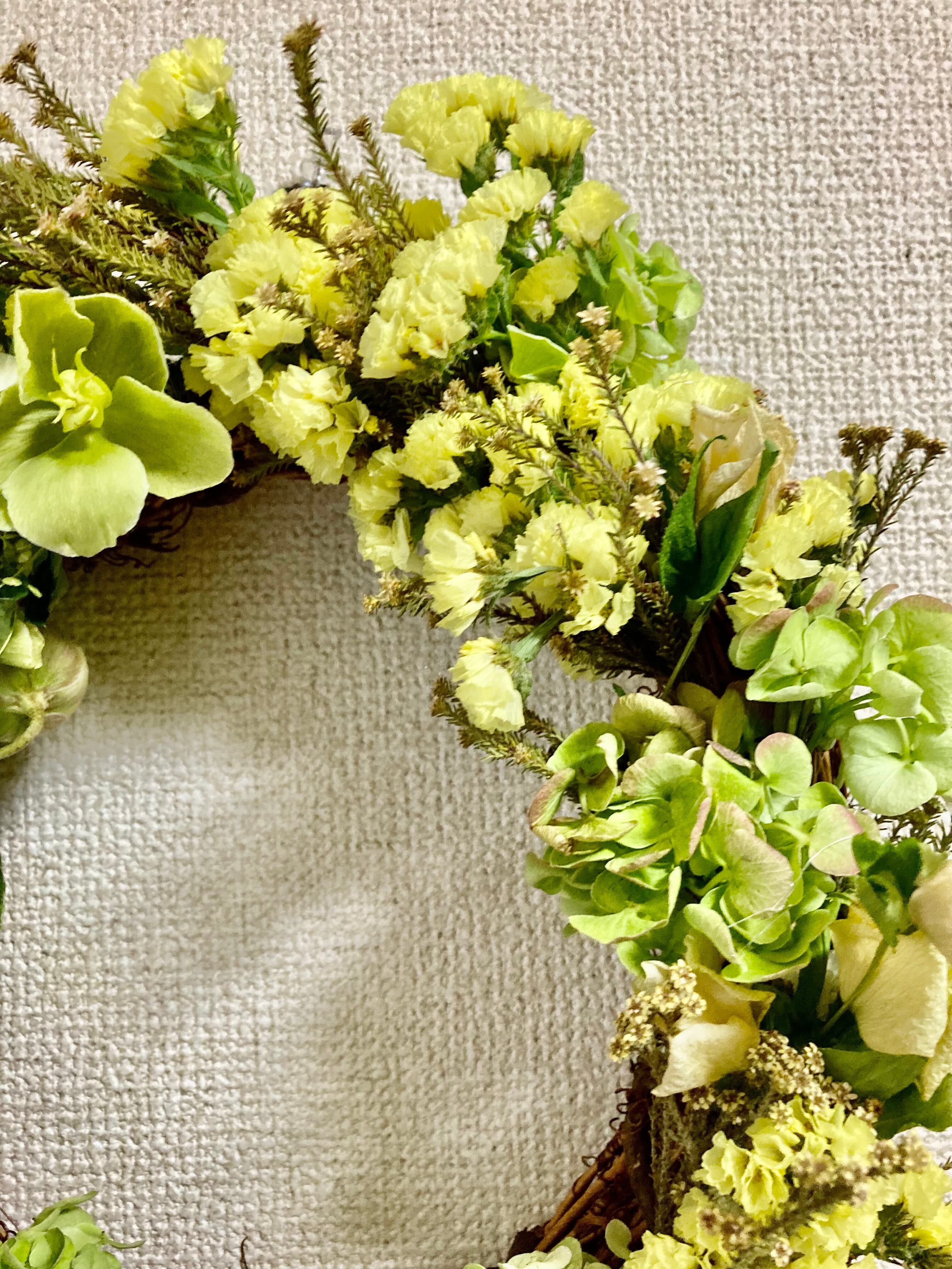 みどり色のお花とレモンイエローのお花を取り入れ、爽やかで華やかな雰囲気のリースに仕上げました。見た目も涼しげで、これからの季節にぴったりなインテリアアイテムとなっています。